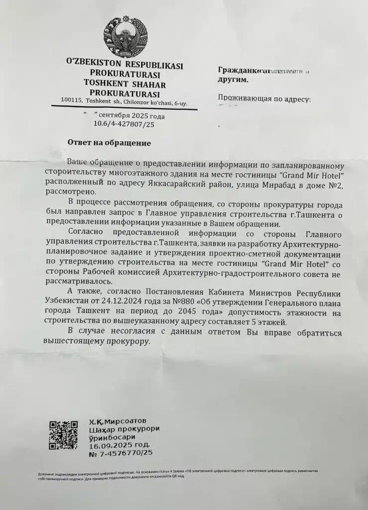 Прокуратура Ташкента рассмотрела обращение жителей махалли «Богсарой» по поводу ситуации вокруг гостиницы Grand Mir Hotel, сообщает блогер Никита Макаренко.
