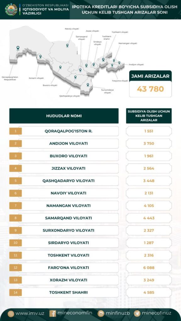 На 3 октября правительство Узбекистана получило 43,7 тыс. заявлений на оформление ипотечного кредита от жителей, передает пресс-служба Минэкономики и финансов.