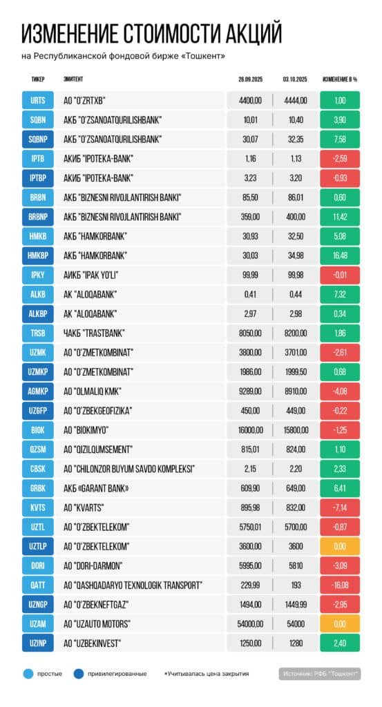 До этого Kursiv Uzbekistan писал, что большинство высоколиквидных акций, торгующихся на РФБ в период с 26 сентября по 3 октября показали смешанную динамику: индекс UCI вырос на 0,49%.