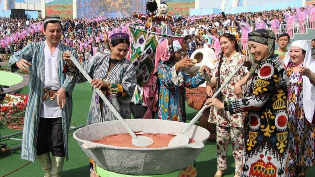 В некоторых районах Узбекистана и сегодня сохраняется обычай: жених и невеста обходят вокруг пламени три раза, прежде чем войти в дом. Этот ритуал означает очищение и начало новой жизни.