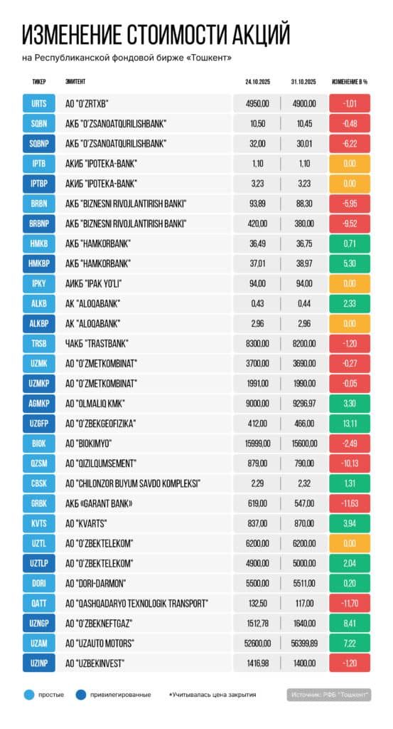 Большинство высоколиквидных акций, котирующихся на Республиканской фондовой бирже (РФБ) «Тошкент» с 24 по 31 октября показали смешанную динамику, фондовый индекс UCI вырос на 0,33%.