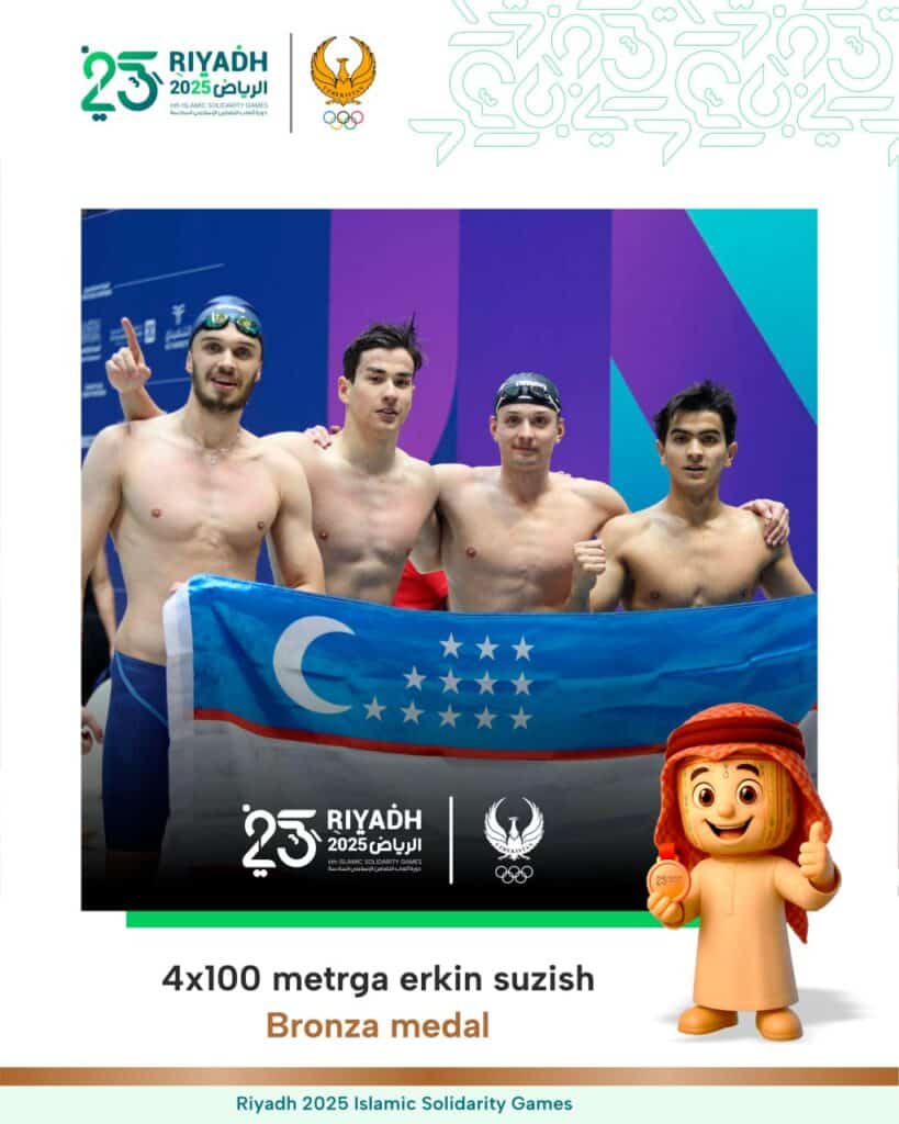 На VI Играх исламской солидарности, проходящих в Эр-Рияде (Саудовская Аравия), узбекские пловцы успешно завершили свое выступление, завоевав бронзовую медаль в мужской эстафете 4×100 метров вольным стилем.