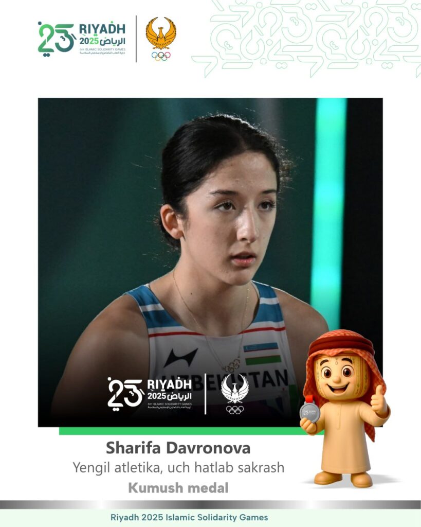 Шарифа Давронова стала серебряным призером в секторе тройного прыжка. Спортсменка показала результат 13,91 метра и завершила выступление на второй позиции.