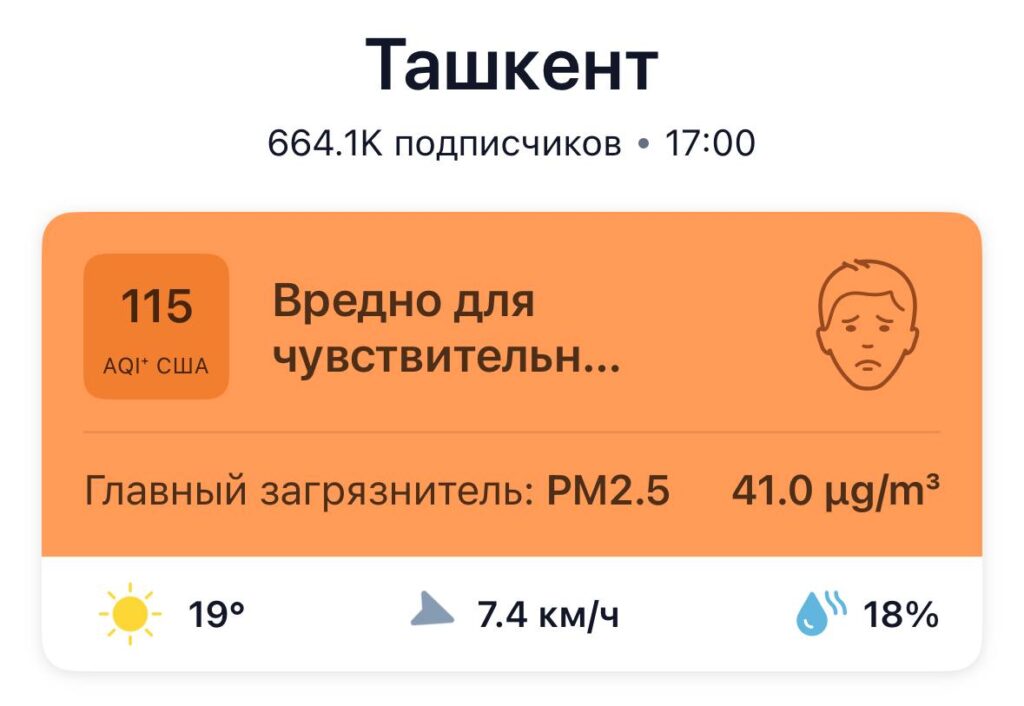 По состоянию на 17:00 18 ноября качество воздуха в Ташкенте оценивается как вредное для чувствительных лиц, с индексом AQI 115. Главным загрязнителем остаются мелкие частицы PM2.5, концентрация которых достигает 41.0 мкг/м³.