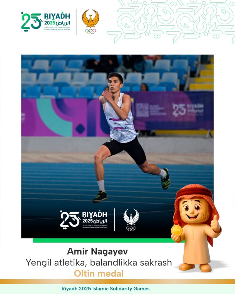 Член сборной Узбекистана по легкой атлетике Амир Нагаев занял первое место в секторе прыжков в высоту. Спортсмен показал результат 2,15 метра и обошел соперников в финальной части соревнований.