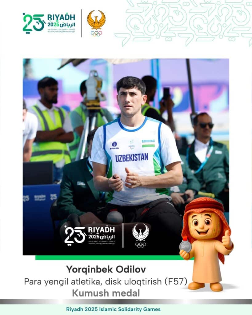 Успешно выступил и представитель пара-легкой атлетики Ёркинбек Одилов. Он участвовал в соревнованиях по метанию диска в категории F57. Показав результат 46,26 метра, спортсмен занял второе место и стал обладателем серебряной медали Игр исламской солидарности.