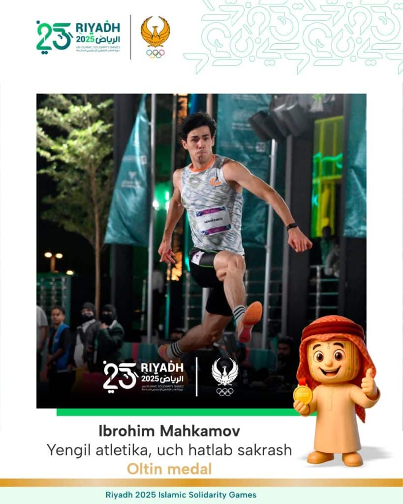 Еще одну золотую медаль сборной Узбекистана принес Иброхим Махкамов. Он выступил в секторе тройного прыжка и продемонстрировал попытку на 16,74 метра. Этот результат позволил спортсмену подняться на высшую ступень пьедестала и укрепить позиции нашей делегации в общем зачете.