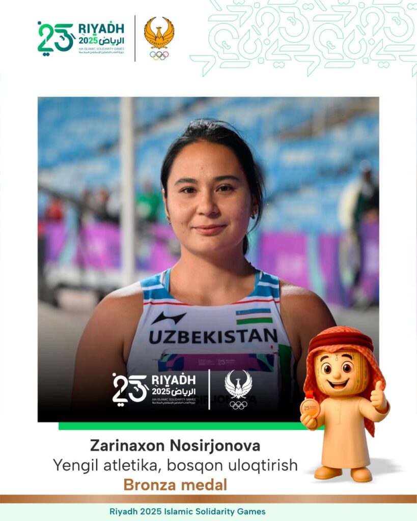 В секторе метания молота успешное выступление показала Заринахон Насиржонова. Она отправила снаряд на 61,69 метра и заняла третье место в итоговом протоколе. Для сборной Узбекистана эта награда стала важным дополнением к сегодняшнему медальному зачету.