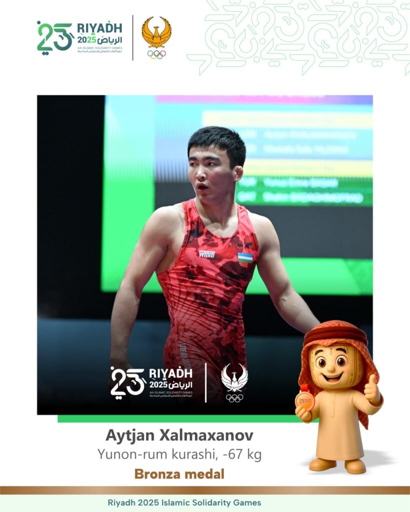 В весовой категории до 67 кг Айтжан Халмаханов успешно выступил в поединке за третье место. Он победил соперника из Катара и добавил в копилку Узбекистана бронзовую медаль. Спортсмен контролировал ход встречи и завершил ее в свою пользу.
