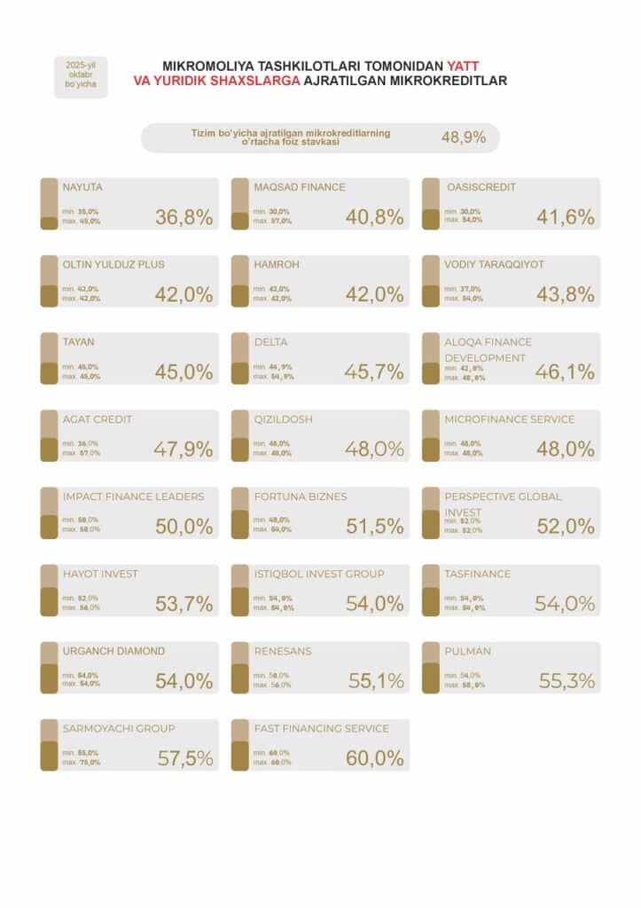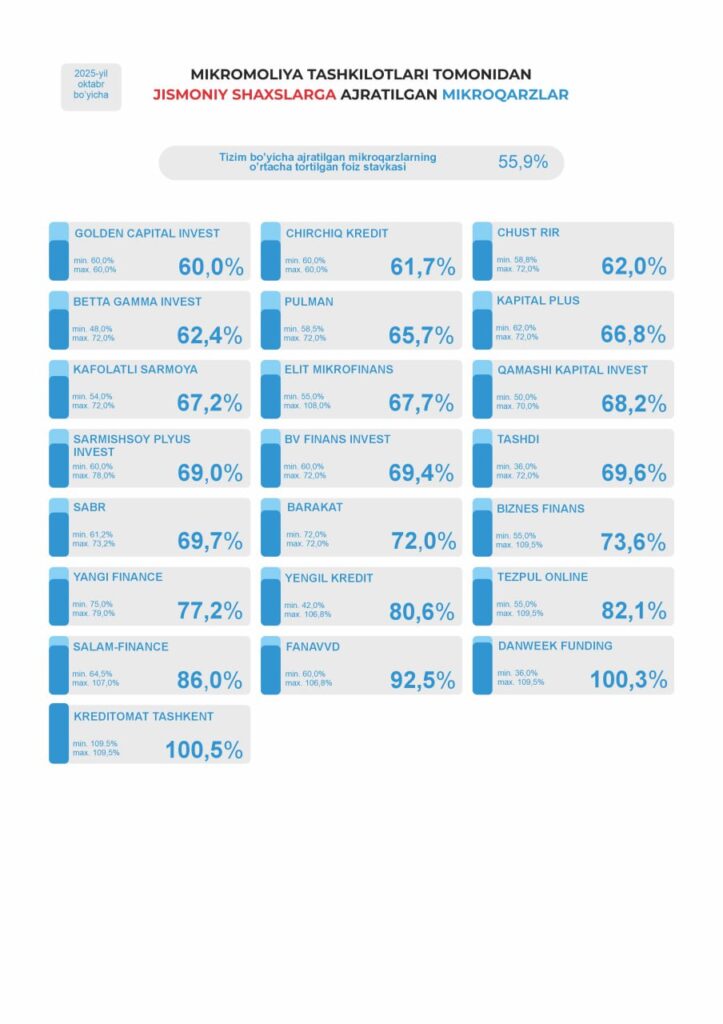 На начало ноября 2025 года в Узбекистане средняя ставка микрофинансовых организаций (МФО) по займам для физлиц — 55,9%, следует из данных ЦБ республики. Для юрлиц— 48,9%.