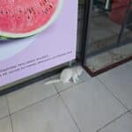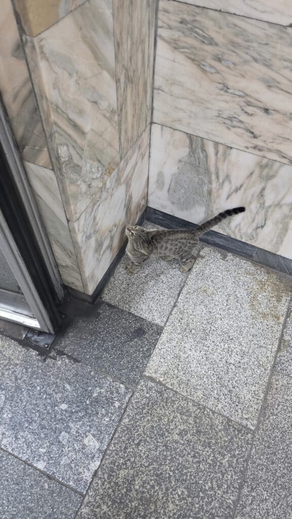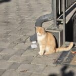 Кот с бело-серыми пятнами идет по тротуару к камере, на заднем плане люди сидят на скамейке.