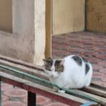 Кот с бело-серыми пятнами идет по тротуару к камере, на заднем плане люди сидят на скамейке.