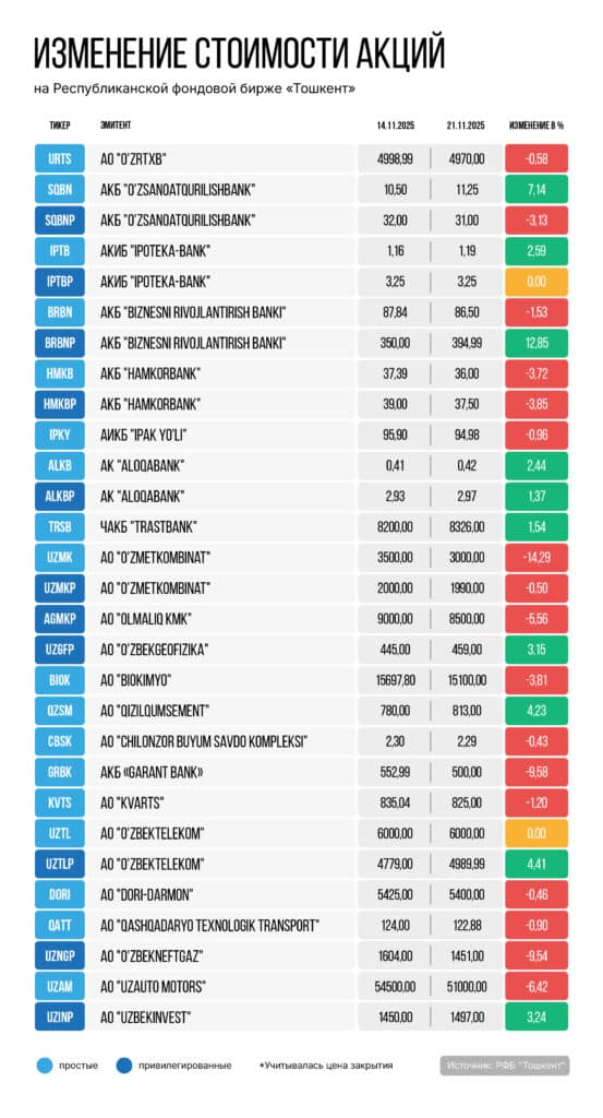 Большинство высоколиквидных акций, торгующихся на Республиканской фондовой бирже (РФБ) «Тошкент» с 14 по 21 ноября, показали положительную динамику: фондовый индекс UCI вырос на 2,3%.