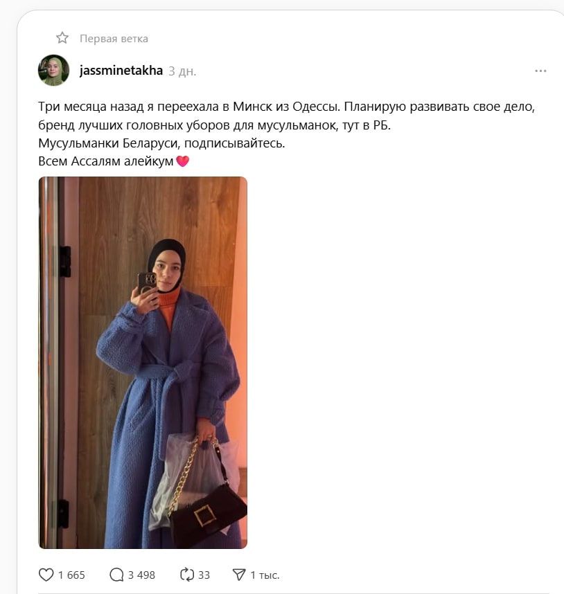 В Threads разгорелся скандал после поста Jassmine Takha, которая сообщила, что переехала из Одессы в Минск и собирается открыть магазин головных уборов для мусульманок. Публикация быстро стала вирусной. На нее отреагировали более 1,6 тыс. пользователей, пост собрал свыше 3,4 тыс. комментариев и около 1 тыс. репостов.