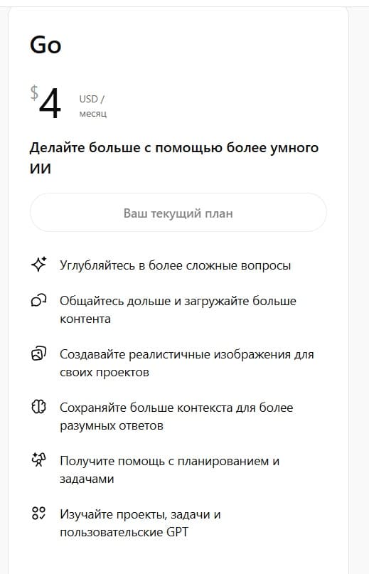 Тариф ChatGPT Go стартовал в 2025 году как более доступная альтернатива плану ChatGPT Plus. Он рассчитан на страны с развивающимися рынками и предоставляет расширенный доступ к моделям, увеличенные лимиты и улучшенную производительность по сравнению с бесплатной версией.