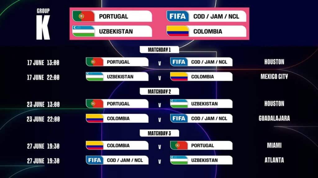 В первом туре подопечные Фабио Каннаваро сыграют против команды Колумбии на легендарной арене «Ацтека» в Мехико. Во втором туре Узбекистан ждет поединок с Португалией на стадионе «NRG» в Хьюстоне. Завершит групповой этап матч против победителя плей-офф отбора, который пройдет в Атланте.