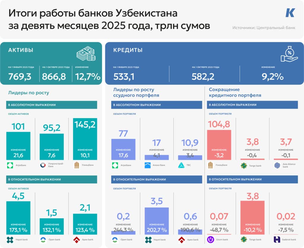 По итогам III квартала 2025 года банки Узбекистана нарастили активы на 12,7%, кредитный портфель — на 9,2%, депозиты — на 20,3%. Чистая прибыль за девять месяцев выросла на 34,7% год к году. На фоне все еще высокой долларизации и укрепления сума на 6,4% такие результаты выглядят убедительно. Однако эффект от укрепления национальной валюты оказался неоднородным: крупнейший банк страны зафиксировал сокращение кредитного портфеля на 3%. Как изменилась ситуация на рынке — в обзоре Kursiv Uzbekistan.