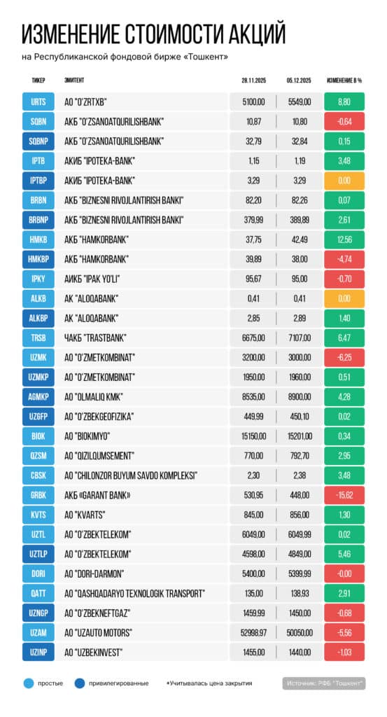 Большинство высоколиквидных акций, представленных на Республиканской фондовой бирже «Тошкент», в период с 28 ноября по 5 декабря продемонстрировали положительную динамику, тогда как фондовый индекс UCI снизился на 3,31%.