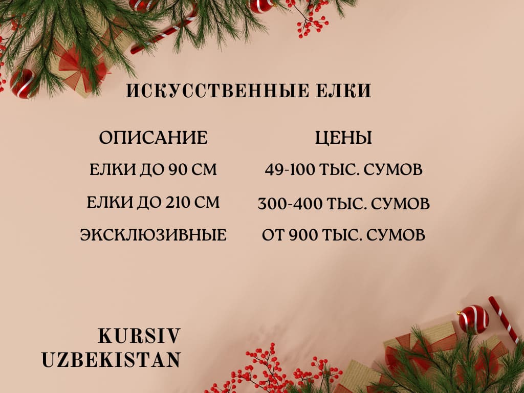 Стандартные искусственные елки высотой 150–210 см стоят в среднем 300–400 тыс. сумов — это самый ходовой сегмент для квартиры.