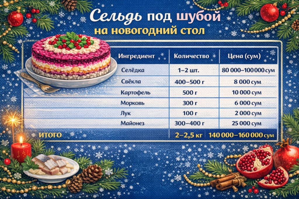 Этот салат редко готовят в малом количестве. Для формы весом 2–2,5 кг нужны одна–две сельди, свекла, картофель, морковь, лук и майонез. Основная статья расходов — рыба, остальное остается в пределах привычного бюджета. Ингредиенты по подсчетам Kursiv Uzbekistan обойдутся в 131–151 тыс. сумов, отложим деньги на салат с запасом. Итого стоимость салата составит 140–160 тыс. сумов.