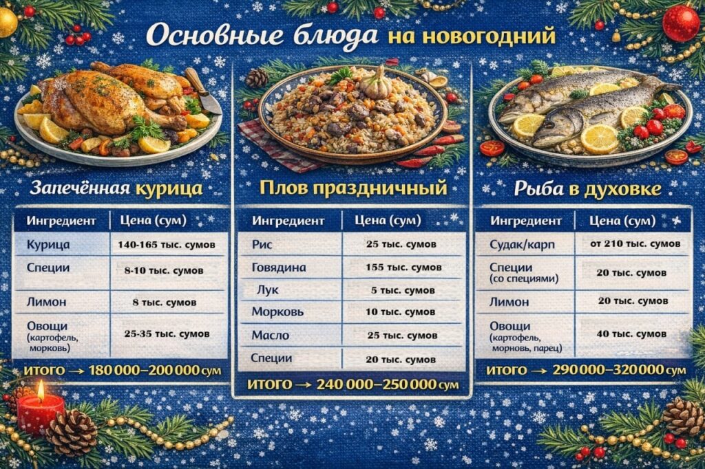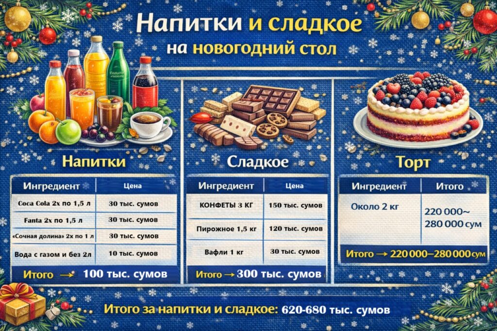 Новый год в Узбекистане — это длинный стол, несколько часов готовки и обязательный запас, «чтобы хватило всем». Kursiv Uzbekistan выяснил, что приготовить на Новый год в Узбекистане и во сколько обойдется новогодний стол для семьи из четырех человек с гостями (в расчете на 6–8 человек) по актуальным ценам на рынках и в супермаркетах.
