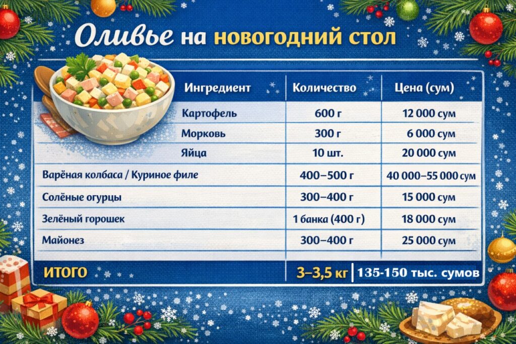Для новогоднего стола оливье готовят с запасом — на 3–3,5 кг: часть уйдет сразу, часть останется на 1 января. Для салата, рецепт которого знает каждый, понадобятся картофель и морковь, 10–12 яиц, вареная колбаса или куриное филе, соленые огурцы, зеленый горошек и майонез. По ценам рынков и супермаркетов оливье обойдется в 135–150 тыс. сумов, по пунктам расходы подробно расписаны на изображении.