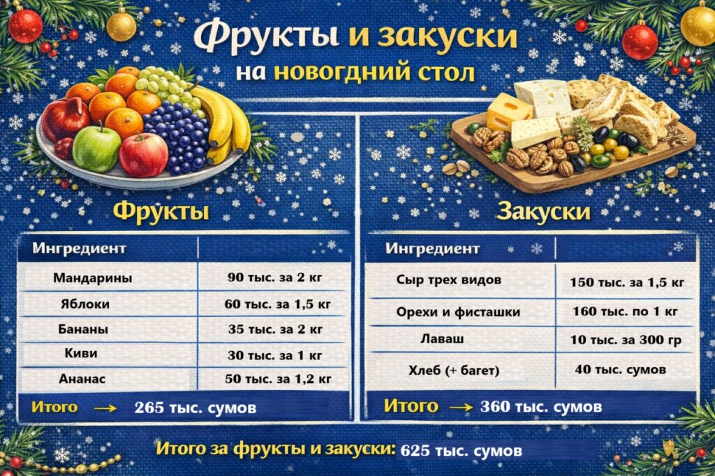 Итого за фрукты и закуски: 625 тыс. сумов.