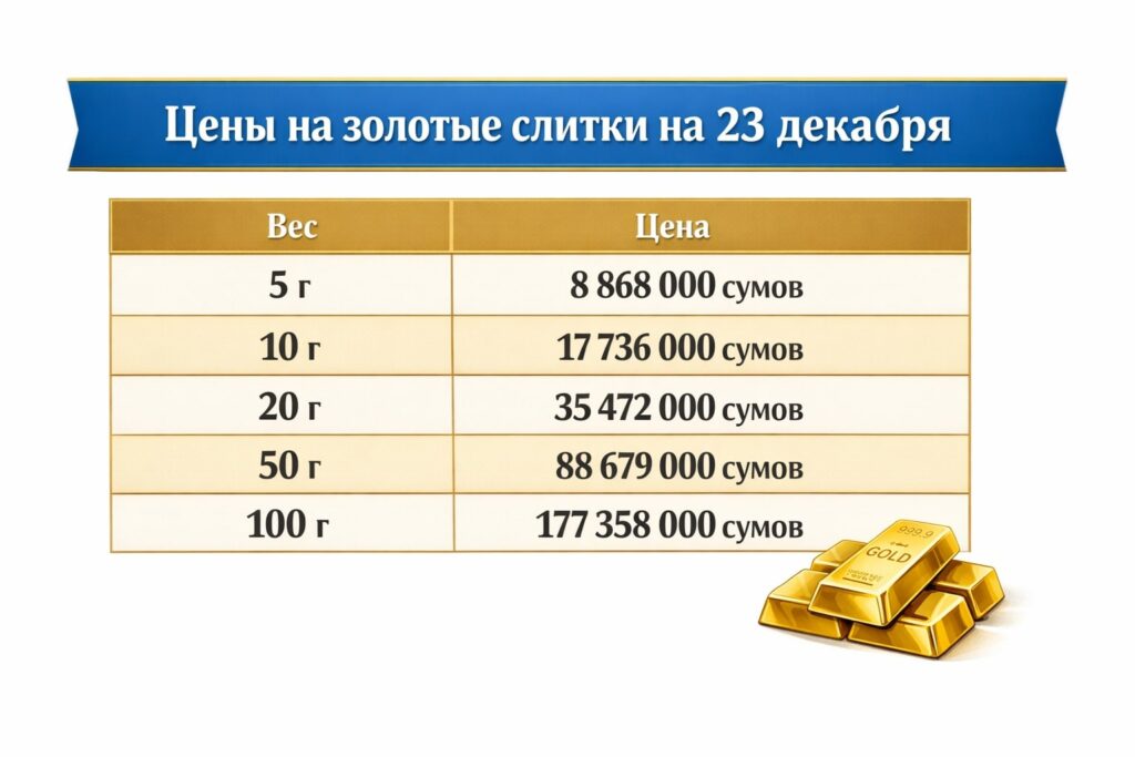 На 23 декабря десять граммов оцениваются в 17,7 млн сумов, 20 граммов — в 35,4 млн сумов. Цена слитка в 50 граммов превышает 88,6 млн сумов, 100 граммов — 177,3 млн сумов.