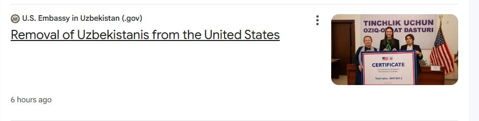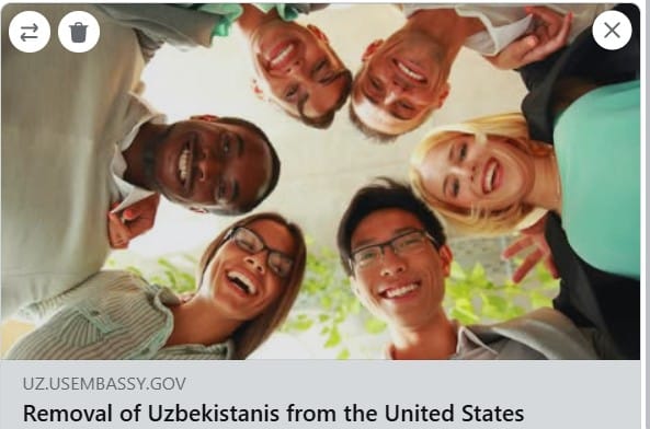 Однако в соцсетях и Google News эта новость отображается иначе. Если скопировать ссылку в Facebook, то появятся фотография улыбающейся молодежи разных цветов кожи и SEO-заголовок Removal of Uzbekistanis from the United States («Депортация узбекистанцев из Соединенных Штатов»).