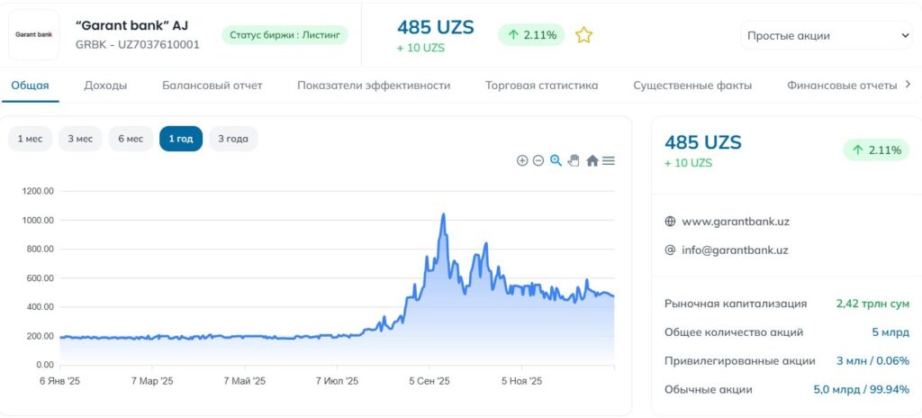 Хотя котировки акций «Гарант банка» в течение года значительно выросли и по состоянию на 1 января 2026 года бумаги входят в список среднеликвидных, объем торгов по ним остается скромным. Так, в декабре 2025 года максимальный дневной оборот по этим акциям был зафиксирован 18 декабря и составил всего 1,4 млн сумов. Это указывает на то, что розничные инвесторы пока не заходят в эти бумаги крупными суммами, несмотря на впечатляющую ценовую динамику.