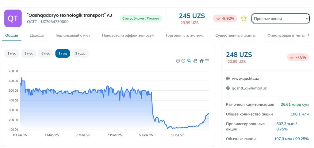Наиболее слабые результаты в 2025 году показали представители промышленности, транспорта и сырьевых отраслей. Сильно упали котировки Qashqadaryo texnologik transport (−55,6%) и Qizilqumsement (−49,3%). О причинах снижения интереса инвесторов к акциям цементных заводов Kursiv Uzbekistan писал ранее.
