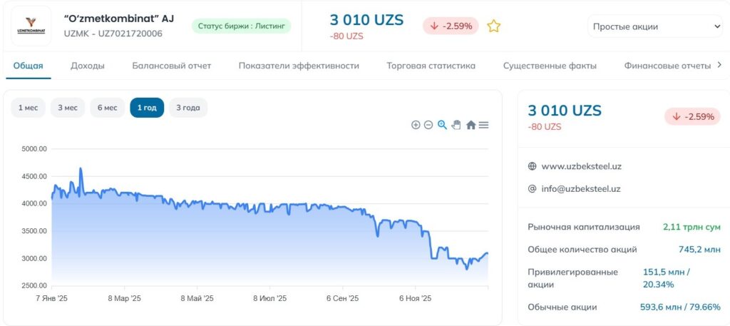 Хотя UzAuto Motors в 2025 году трижды выплачивала дивиденды своим акционерам, котировки ушли вниз. С учетом всех выплат совокупный дивиденд за год достиг 6139 сумов на акцию, что составляет примерно 12% от рыночной цены бумаг.