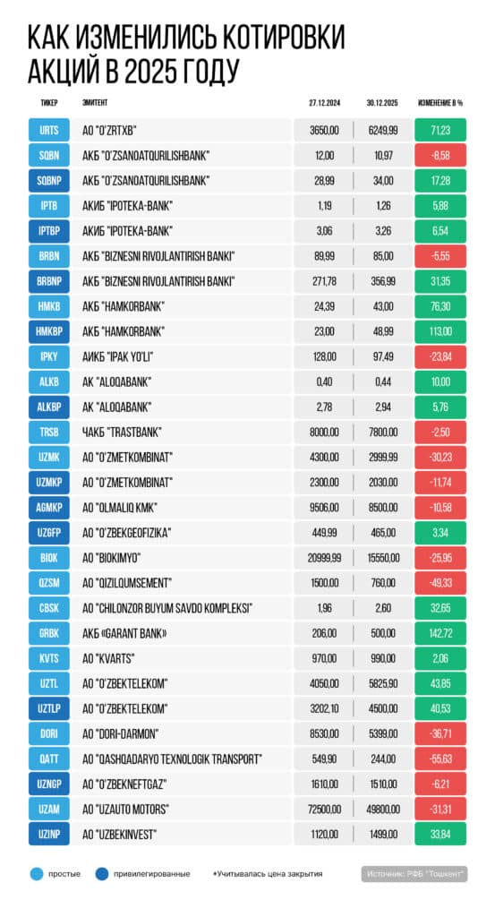 Наиболее заметный рост в 2025 году продемонстрировали акции банков. Среди лидеров — бумаги «Гарант банка», подорожавшие более чем в два раза — на 142,7%. Существенный рост также показали акции Hamkorbank: обыкновенные выросли на 76,3%, привилегированные — сразу на 113%.