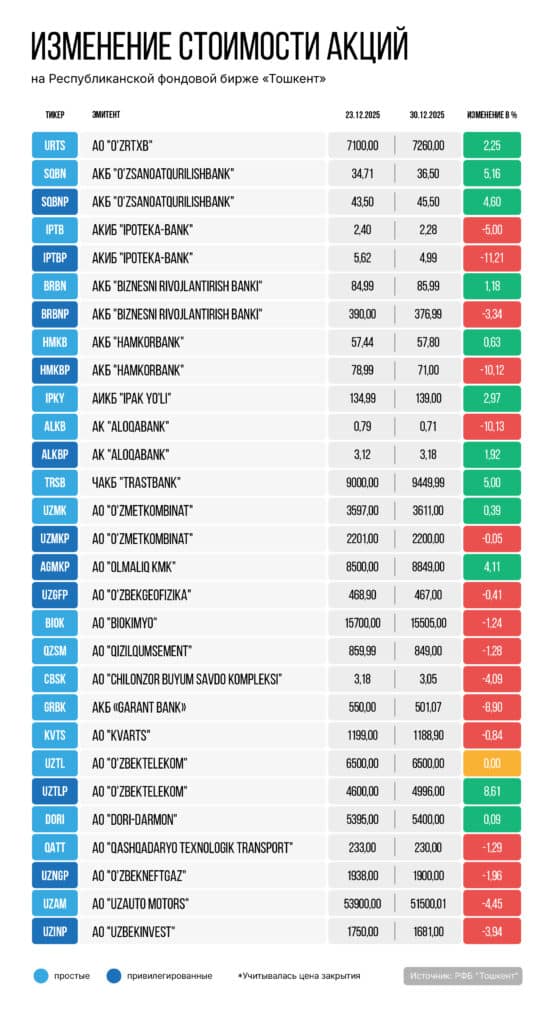 Большинство высоколиквидных акций, представленных на Республиканской фондовой бирже (РФБ) «Тошкент», с 23 по 30 января продемонстрировали отрицательную динамику. Индекс за прошлую неделю UCI упал на 0,4%.
