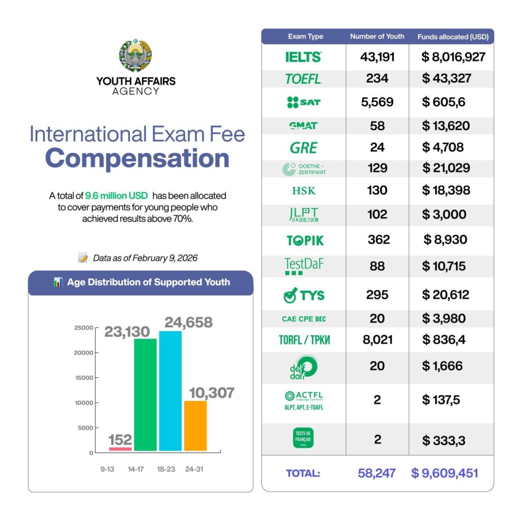 На 9 февраля молодым узбекистанцам выделили $9,6 млн на компенсацию за прохождение языковых экзаменов, сообщил глава Агентства по делам молодежи Алишер Садуллаев.