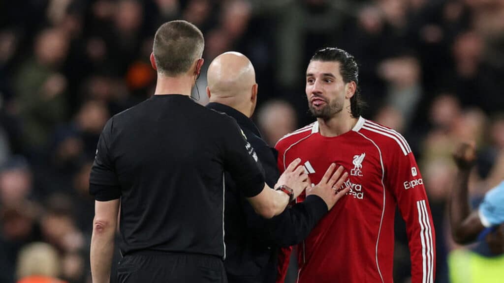 После вмешательства VAR арбитр Крейг Поусон отменил гол «Ливерпуля» и удалил Доминика Собослаи в матче против «Манчестер Сити» (1:2). Фото: Reuters