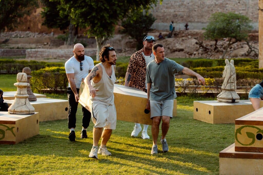 На первом испытании игрокам нужно было собрать большую шахматную доску и воспроизвести комбинацию фигур на вершине горы.