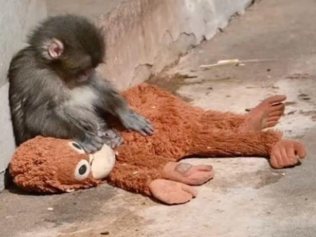 Для детенышей макак очень важен контакт с матерью, поэтому работники попробовали дать малышу «суррогатную маму» — сначала полотенце, затем мягкие игрушки.