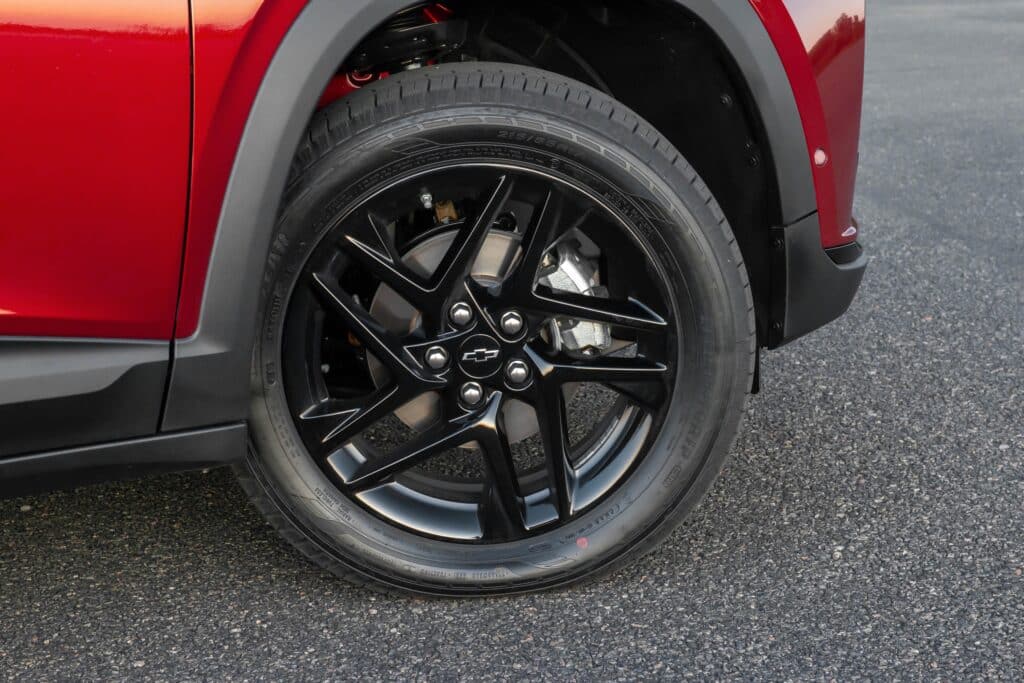 Салон Chevrolet Tracker RS 2026 выполнен в черном цвете с красной прострочкой.