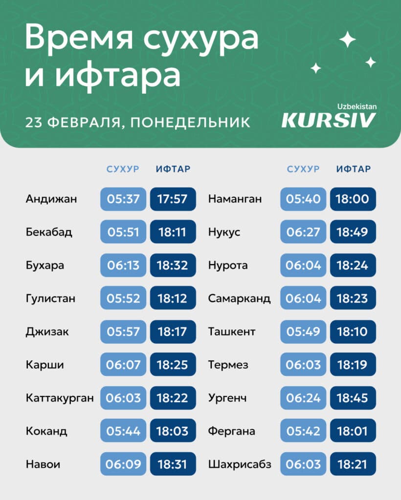 23 февраля сухур (сахарлик) в столице Узбекистана закончится в 5 часов 49 минут, ифтар (ифторлик) начнется в 18 часов 10 минут.
