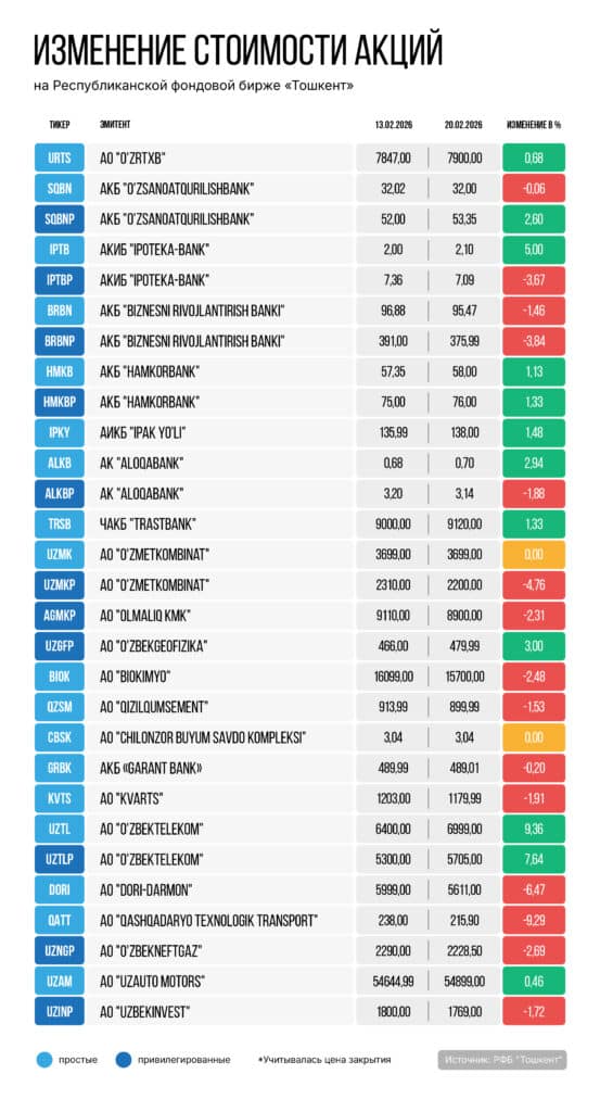 Большинство высоколиквидных акций, представленных на Республиканской фондовой бирже (РФБ) «Тошкент», в период с 13 по 20 февраля показали отрицательную динамику. При этом фондовый индекс UCI вырос на 2,3%.