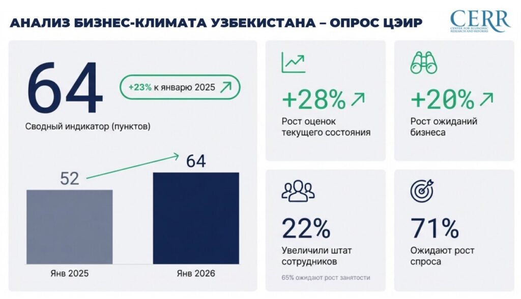 В январе 2026 года деловая уверенность в Узбекистане заметно выросла за счет улучшения ожиданий предпринимателей. Сводный индекс бизнес-климата достиг 64 пунктов, сообщил Центр экономических исследований и реформ (ЦЭИР) по итогам ежемесячного опроса.