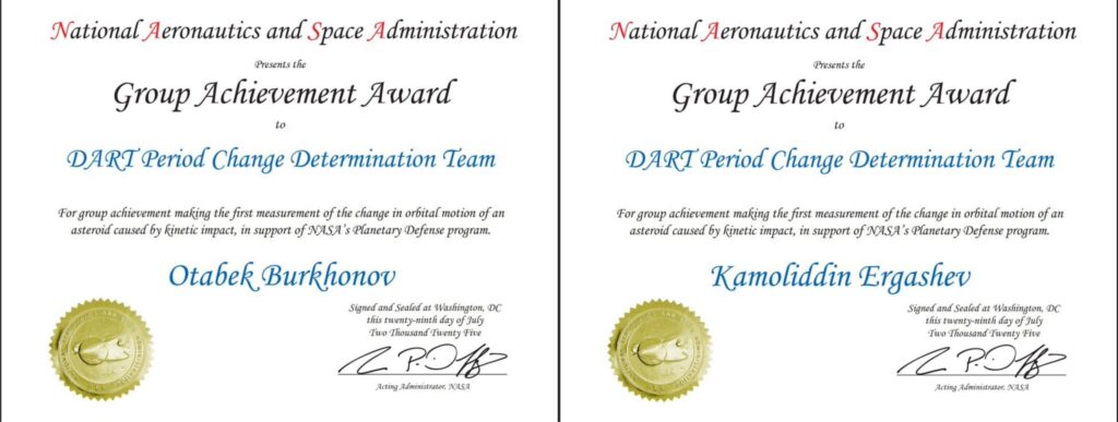 Американское агентство NASA наградило двух специалистов из Узбекистана групповой премией за достижения, сообщили в Академии наук РУз. Ими стали сотрудники Астрономического института имени Мирзо Улугбека Отабек Бурхонов и Камолиддин Эргашев.