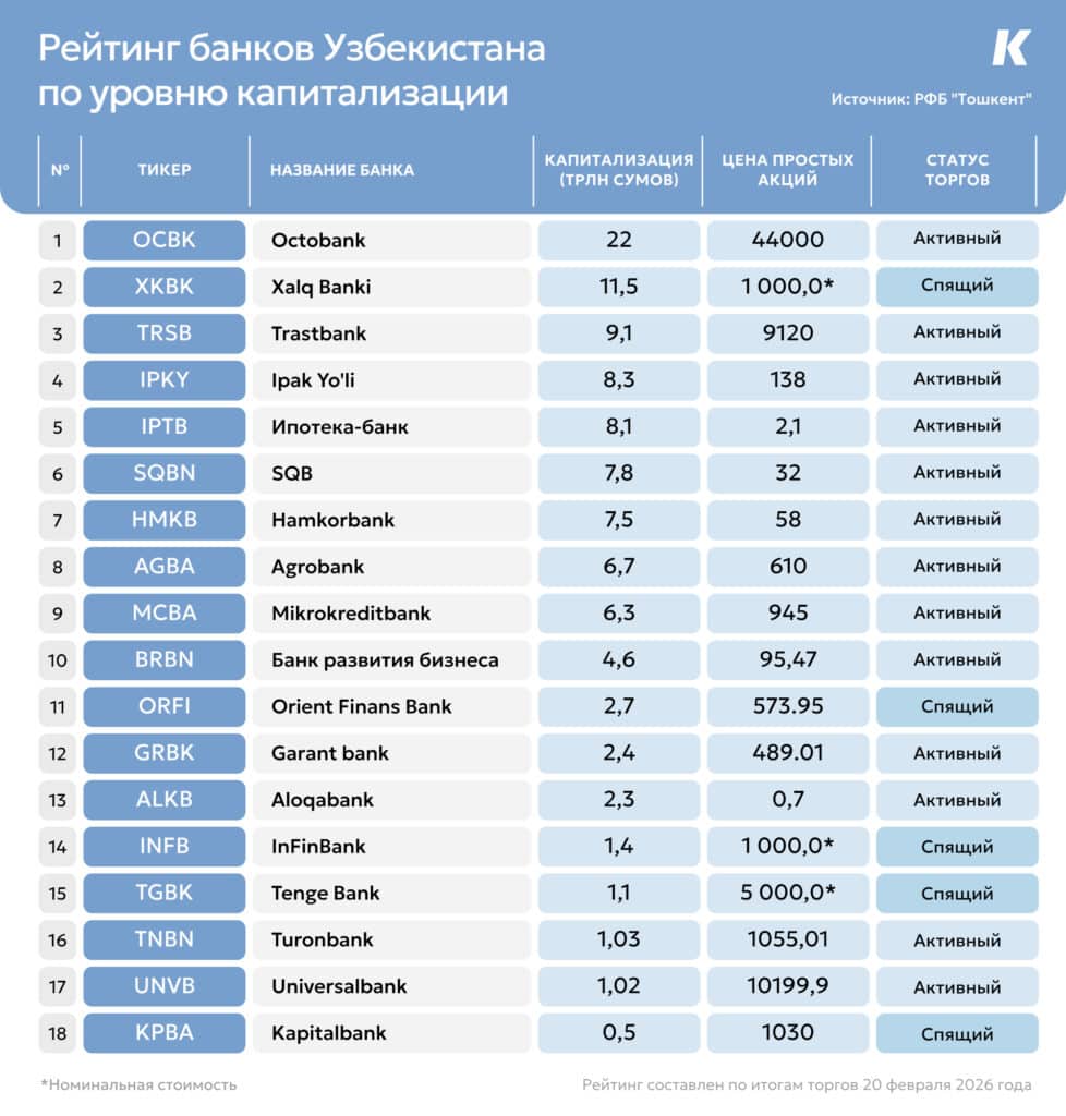 Представленный рейтинг базируется на официальных данных биржи, однако важно понимать специфику ценообразования. В условиях низкой ликвидности узбекистанского фондового рынка не все игроки имеют истинную рыночную капитализацию. Для банков, по которым сделки не проводились месяцами или годами, показатель рассчитан номинально исходя из уставного фонда или цены последней исторической сделки. Для активных эмитентов капитализация отражает актуальный баланс спроса и предложения на 20 февраля 2026 года.