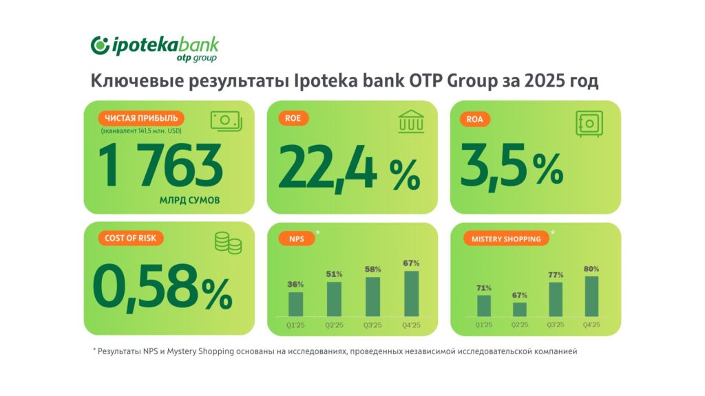 2025 год стал для Ipoteka bank OTP Group годом уверенного роста и позитивных изменений. Чистая прибыль банка составила 1,763 трлн сумов, рентабельность капитала (ROE) достигла 22,4%, а активов (ROA) — 3,5%.