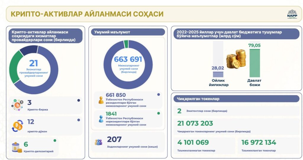 - Пользователи: Общее количество клиентов криптосферы достигло 663 691. Подавляющее большинство из них — 661 850 — являются резидентами Узбекистана. Число нерезидентов составляет 1 841 человек.