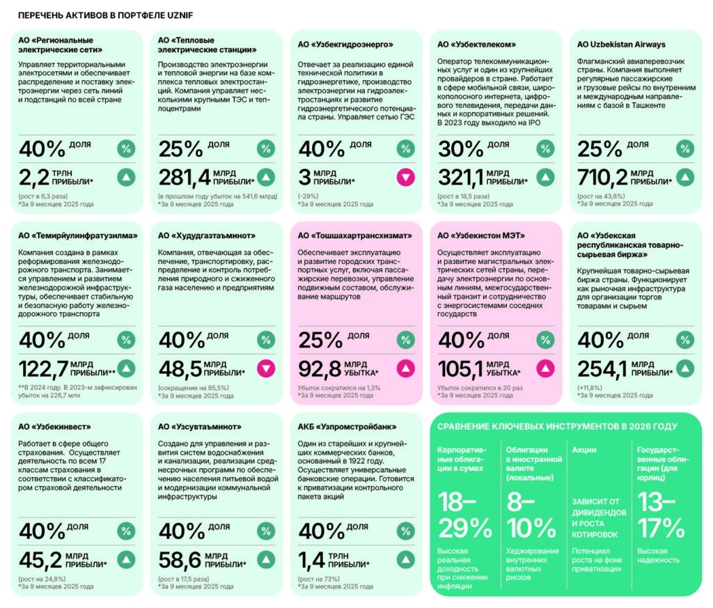 «Ключевым событием 2026 года может стать IPO Национального инвестиционного фонда Узбекистана (UzNIF). Это не просто отдельная сделка, а инфраструктурный шаг. UzNIF консолидировал доли государства более чем в 10 крупнейших компаниях. Его выход на биржу станет «точкой входа» в экономику страны для глобальных фондов, которым нужен диверсифицированный инструмент», — подчеркивает аналитик Freedom Broker.