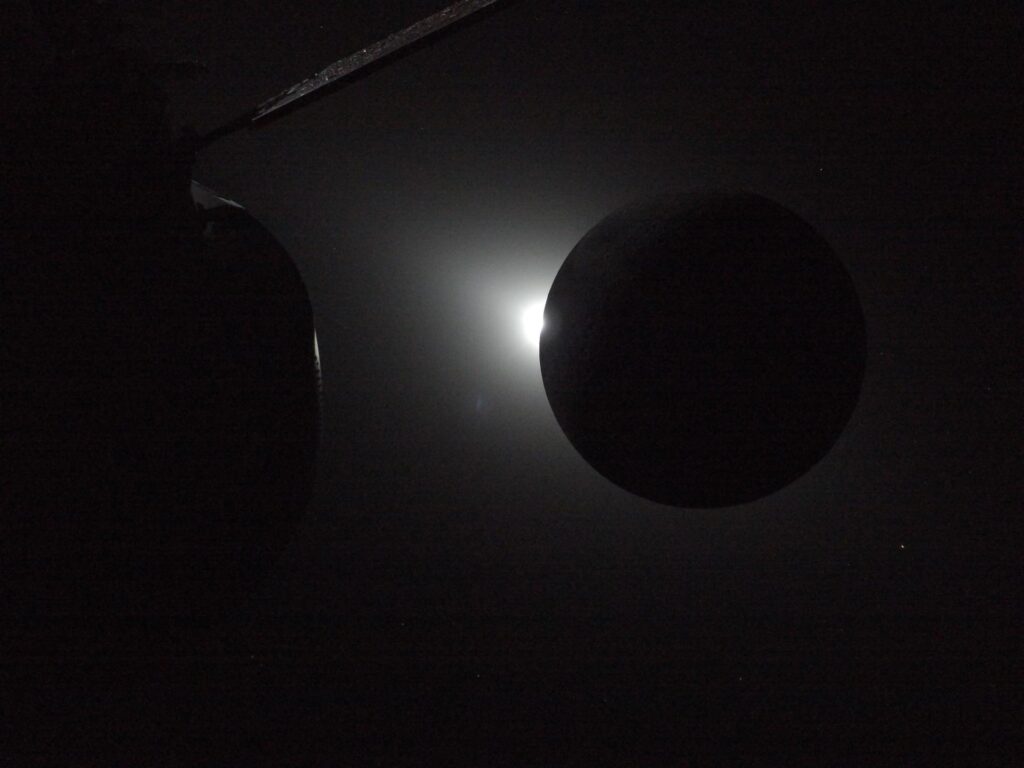 Пока Солнце было скрыто за Луной, экипаж наблюдал полностью затемненную поверхность спутника — редкую возможность увидеть явления, обычно недоступные при ярком освещении.