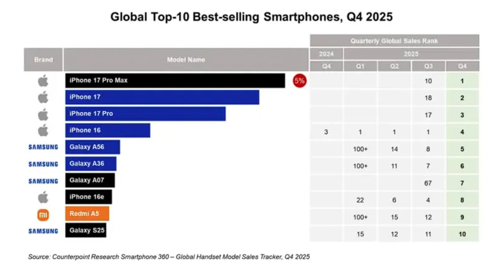 Лидером продаж стал iPhone 17 Pro Max, который занял первое место и обеспечил около 5% всех мировых продаж смартфонов. Вторую позицию занял базовый iPhone 17, а третье место досталось более продвинутой версии iPhone 17 Pro.