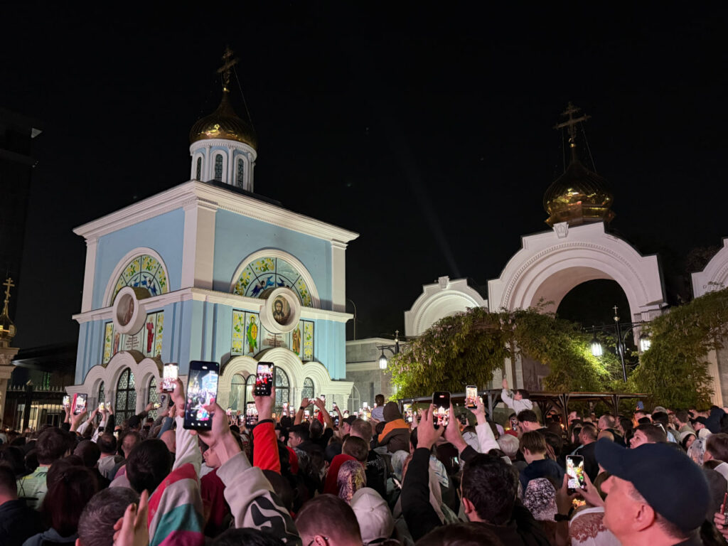 Для тех, кто не смог попасть внутрь храма, богослужение транслировали на большие экраны, установленные на территории собора. Это позволило верующим наблюдать за ходом службы и участвовать в праздничной ночи даже за пределами здания.